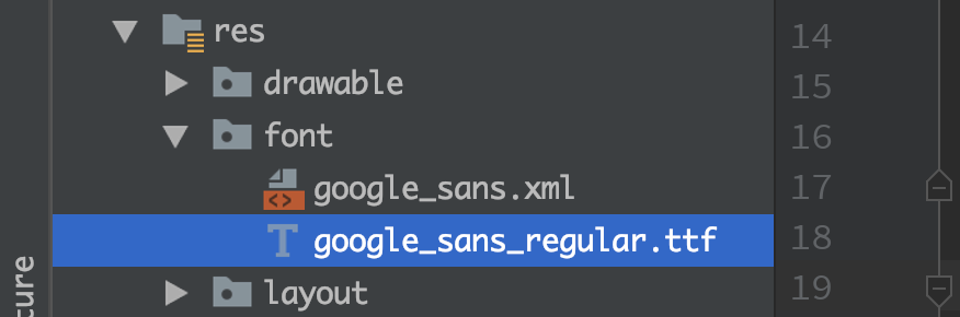 此时 Android studio 会在 res > font 下生成相应的字体标识文件,用于安装后系统识别并下载字体。