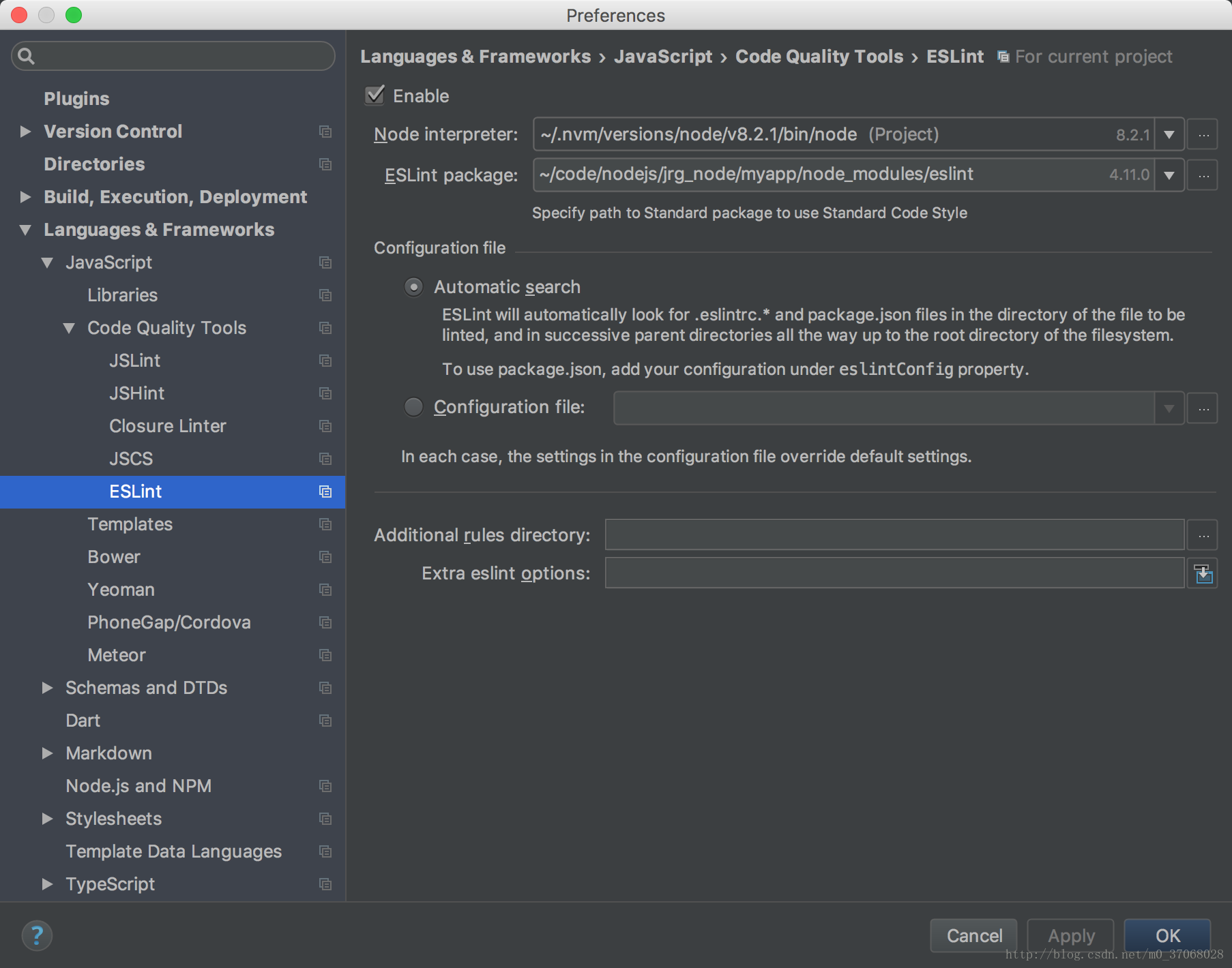 把Disable when no ESLint config is found的对钩去掉。这个选项的意思是说:如果你的javascript项目文件夹中没有.eslintrc这样的配置文件的话,那么ESLint就不起作用。在这里,我们要设置为全局lint,不需要在每个javascript文件夹中包含.eslintrc文件,所以要把它去掉,否则由于我们的项目文件夹中没有.eslintrc文件,ESLint会不起作用。